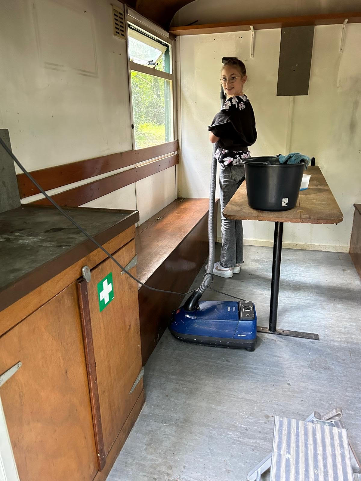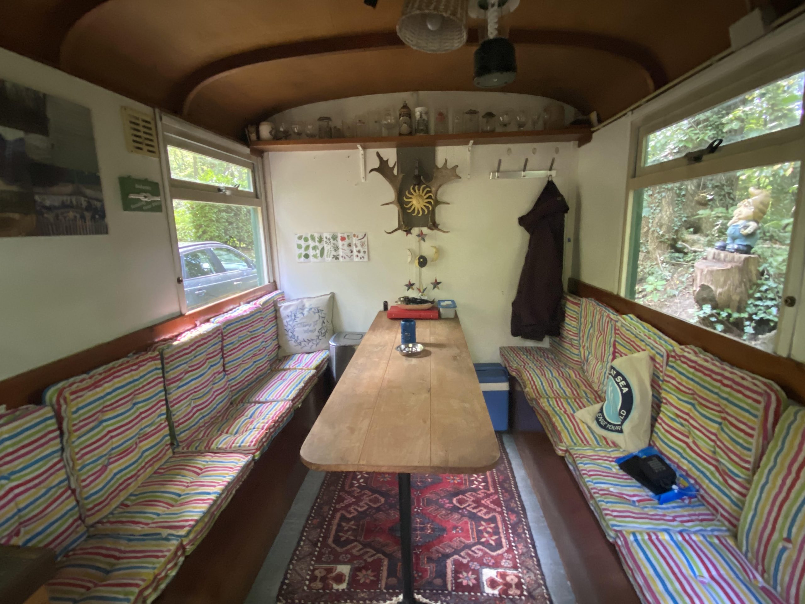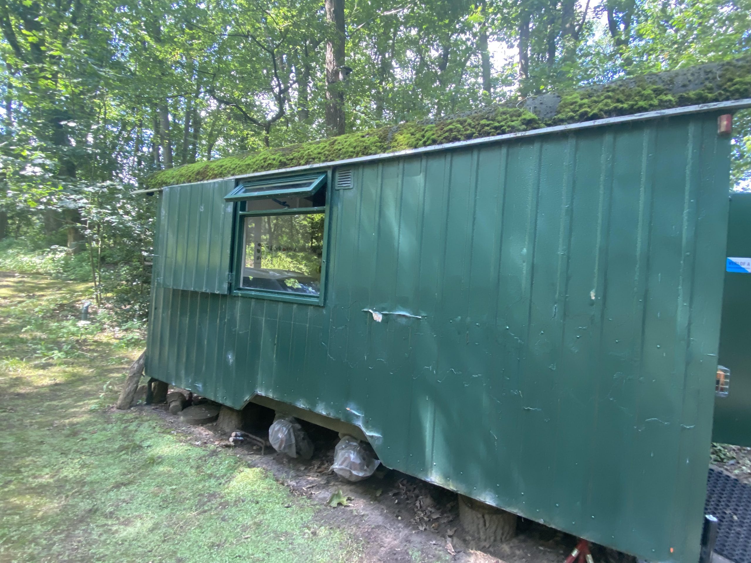 Hier ging ik een pipowagen schoonmaken in een bos. Zo ziet hij eruit van de buitenkant.